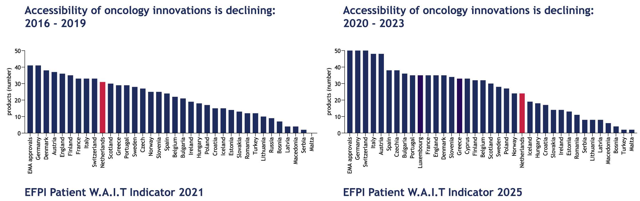 In the Netherlands, as already stated, this is further exacerbated by the declining accessibility to oncology drugs over time. As the bar graphs below from the EFPIA (European Federation of Pharmaceutical Industries and Associations) Patients W.A.I.T. (Waiting to Access Innovative Therapies) Indicator illustrate, we are moving in the wrong direction.
