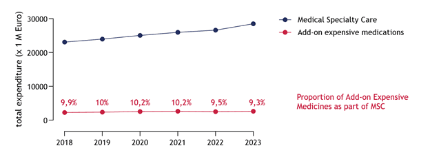 Proportion of add-on innovative medicines as part of Medical Specialty Care (MSC) budget remained stable over time.