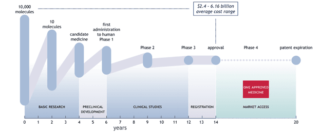 Discovering, developing and delivering innovations for life-threatening diseases takes a long time, and involves significant risk and substantial investments. Typically, only one drug emerges from a pool of 10,000 molecules and 10 to 15 years of rigorous research, testing, and regulatory approval, including preclinical studies, clinical trials, and manufacturing optimization.[5] An analysis of the R&D input, output, and outcome of 16 leading research-based pharmaceutical companies over 20 years (2001-2020) showed an average of $2.4 to 6.16 billion total R&D expenditures per new drug.[6]
